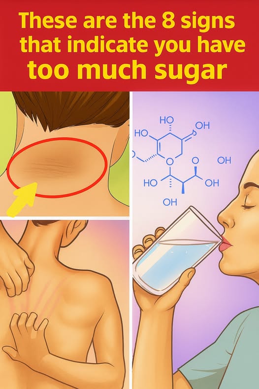 One visible sign of too much sugar is the appearance of dark, velvety patches on areas like the neck, armpits, or back. This is often linked to insulin resistance.