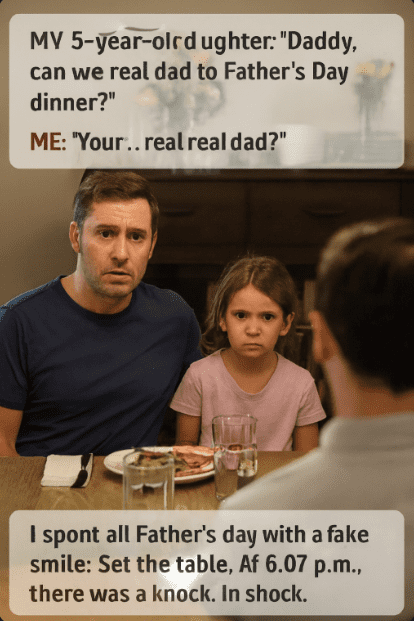 We were driving home from daycare, the late afternoon sun casting long shadows across the road, when my five-year-old daughter turned in her car seat and asked, “Daddy, can we invite my real dad to dinner on Father’s Day?”