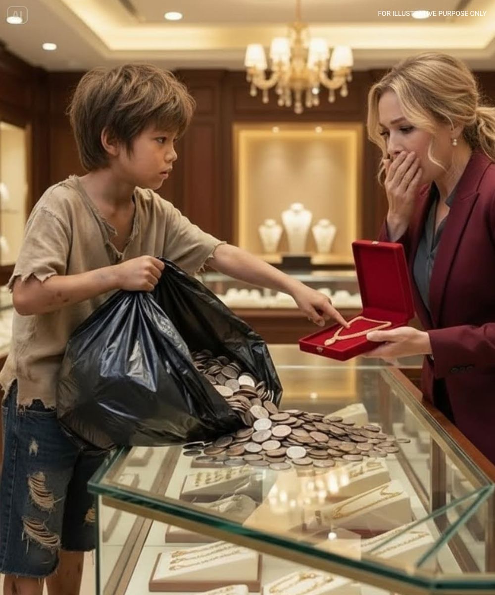 A small, ragged boy silently poured thousands of coins across the glass counter of an upscale jewelry shop.