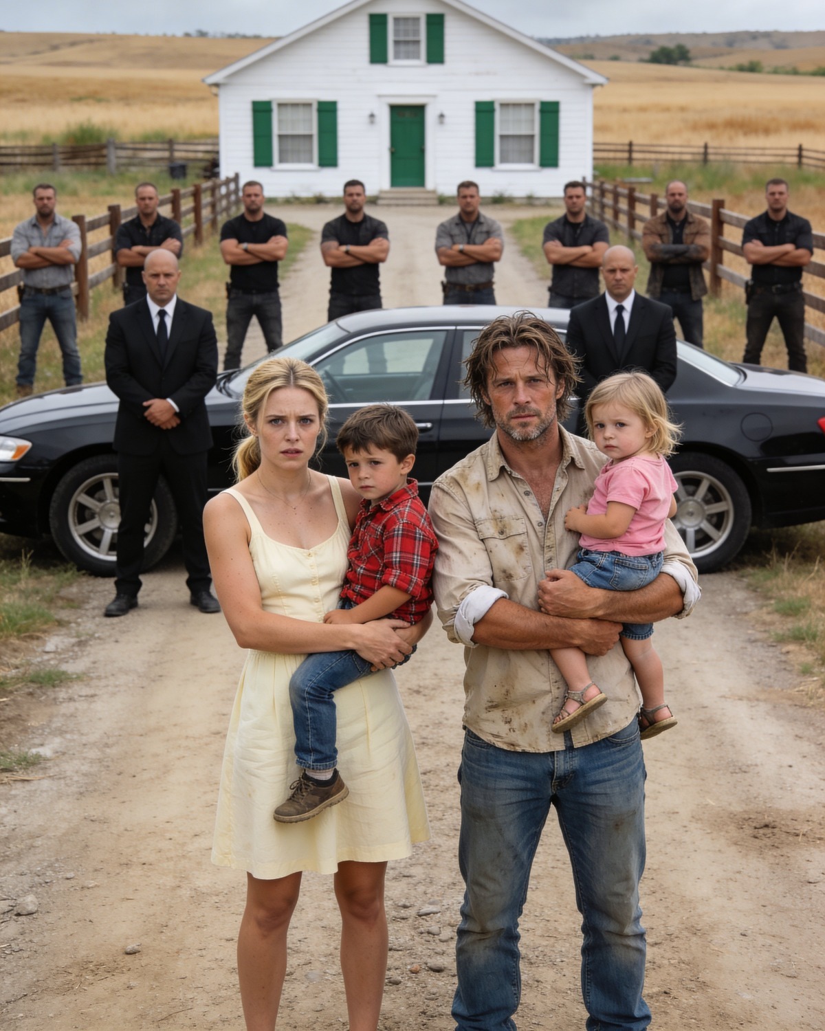 Benjamin didn’t turn. He watched the lead car come to a halt just past the rusted gate. “Three cars. Black. They’re stopping at our drive.”