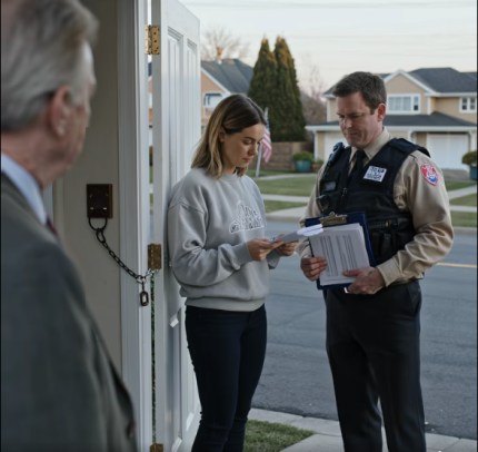 I flipped the porch light on and looked through the peepphole. A deputy sheriff stood on my front step in a tan uniform with a black vest, one hand holding a clipboard of papers. Behind him, his patrol car sat at the curb with its lights off like he decided not to wake the whole street.