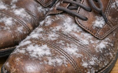 I pulled out shoes I haven’t worn all winter and found white fuzzy patches growing on the leather. What is this?