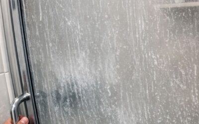 My glass shower doors look cloudy with a white film no matter how much I clean them. What’s causing it?
