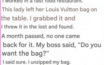 Once, while working at a fast food restaurant, I discovered a woman’s Louis Vuitton handbag on the table. After waiting…