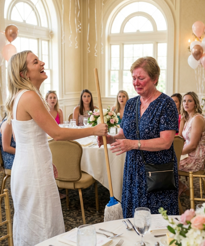 The room went silent. Emily didn’t look at the hosts or the catering staff. She looked directly at me. Then, she reached beside the catering station, grabbed a mop that had been placed there with chilling intentionality, and walked it over to me.