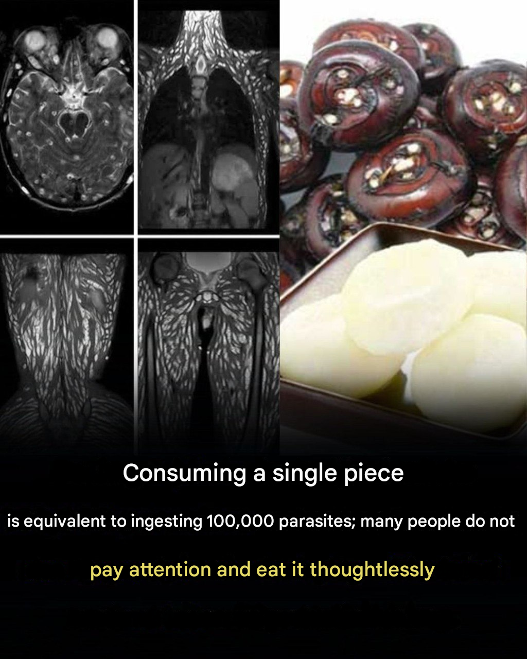 Fish (especially salmon, herring, cod): May contain Anisakis worms, which can cause severe stomach pain, vomiting, and allergic reactions.