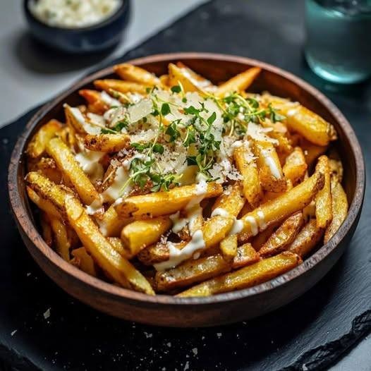 To serve: Arrange the fries in a wooden bowl. Drizzle with truffle mayonnaise.