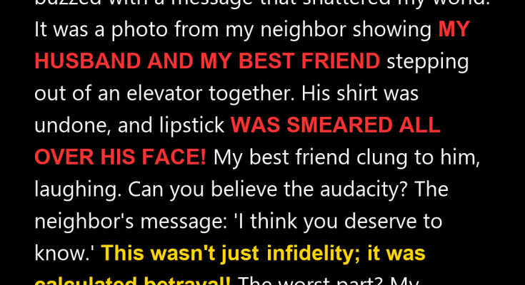 I was in another state, dealing with the immense grief of burying my mother, when my phone buzzed. The message was from my neighbor, someone I barely knew beyond polite greetings. Attached was a photo that would forever change my life. The image showed **my husband and my best friend** stepping out of an elevator together. His shirt was hanging open, exposing his chest, and there was lipstick smeared across his mouth and down his neck. My best friend was pressed against him, laughing, seemingly without a care in the world. Below the photo, a simple yet devastating message: “Something seems wrong here. I don’t want to ruin your life, but I wish someone had warned me when my ex cheated. I think you deserve to know.”