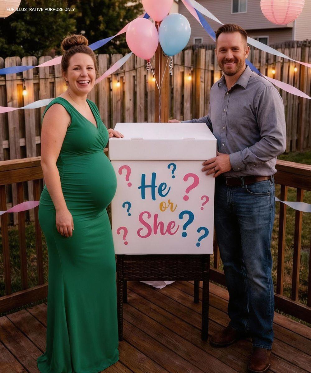 We decided to host a big gender reveal because our families love celebrations. A backyard party. Decorations. Cupcakes. Cameras everywhere. One oversized white reveal box as the centerpiece.
