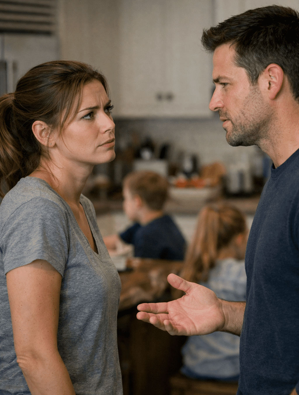 She was standing at the kitchen counter, gathering her hair into a loose tie—the way she does when she’s trying not to sound like something matters too much. Behind her, our three children were arguing about homework, a missing sock, and who had taken the blue cup. Ordinary chaos. Our life.