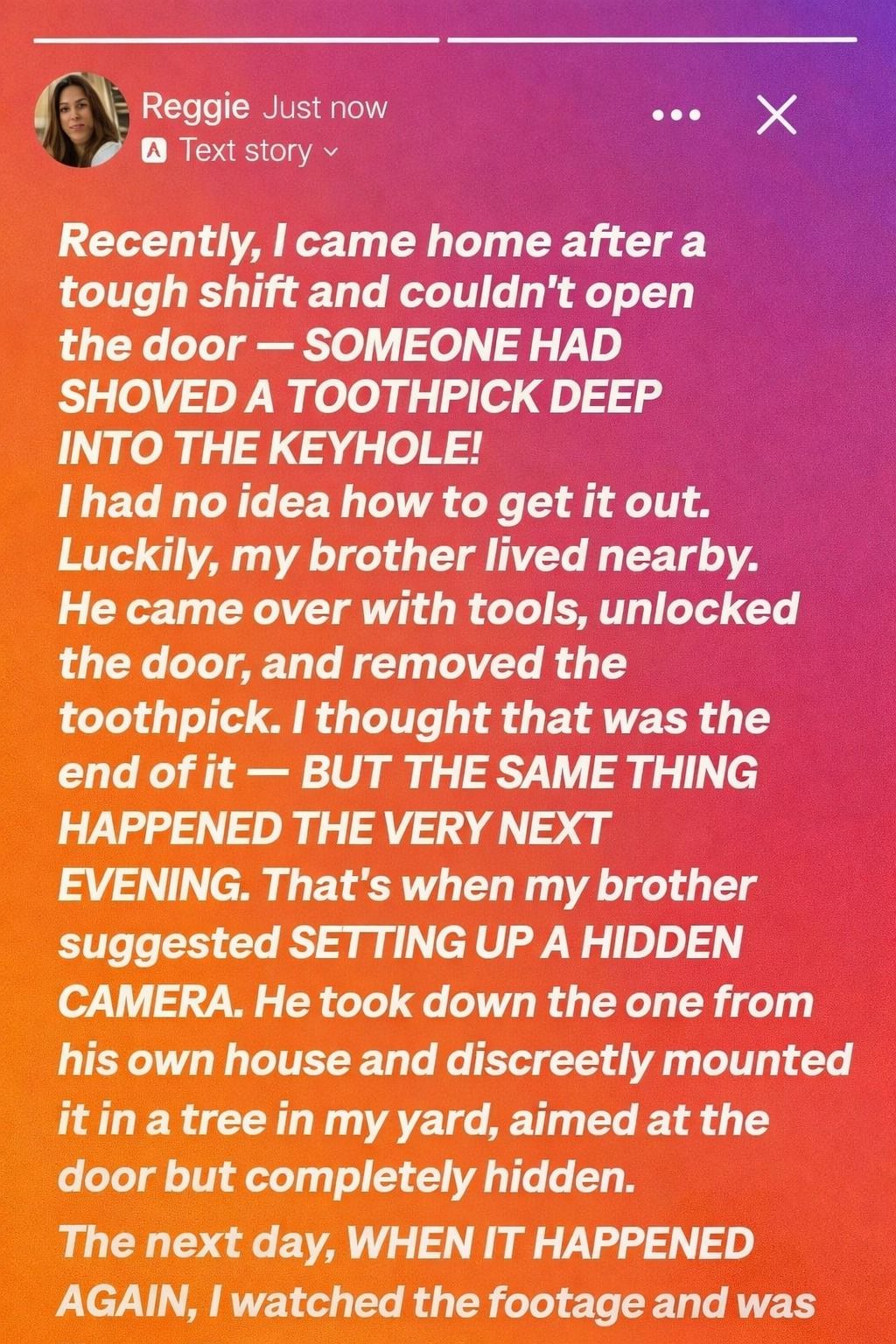 After a long shift one evening, I came home and couldn’t unlock my front door. Someone had jammed a toothpick deep into the keyhole. My brother came over with tools, fixed it, and we laughed it off—until it happened again the next night.