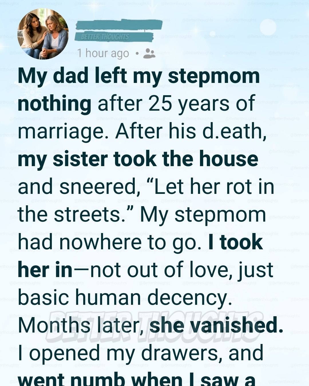 The real devastation came after the will was read—and my stepmother, Sandra, was left with nothing. Not a dollar. Not a roof. Not even the dignity of acknowledgment after 25 years of marriage.