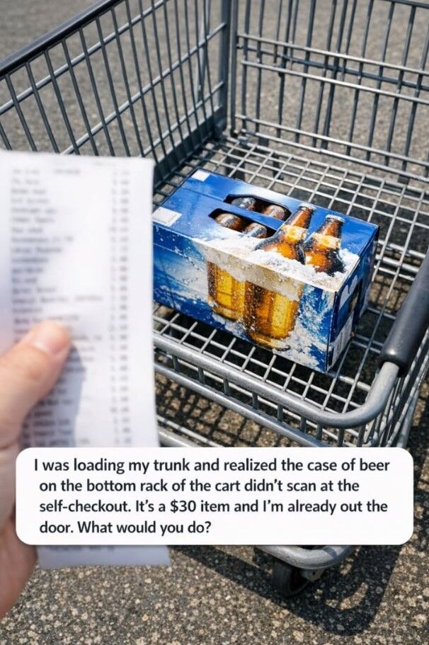 In this case, it’s a case of beer—something that was placed on the bottom rack of the cart and completely overlooked during checkout. It’s already too late. You’ve paid, you’ve left the store, and now you’re standing outside with a decision to make.