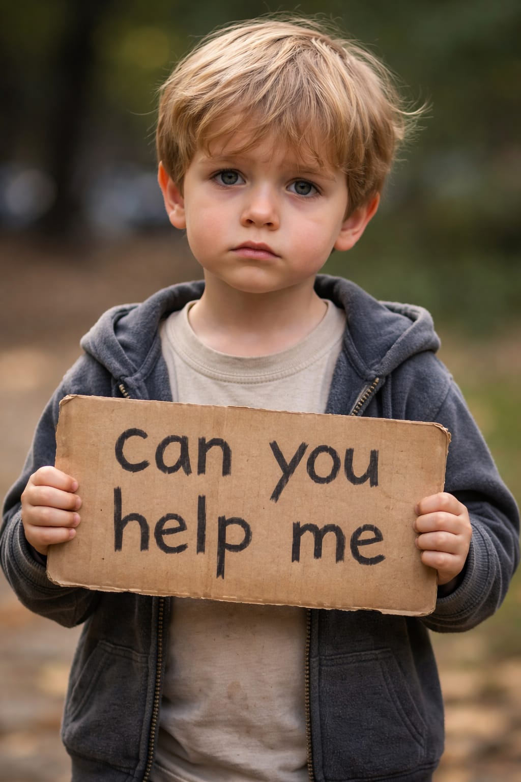 The little boy stood there, small hands gripping a worn piece of cardboard. The words were simple, written in uneven black ink: