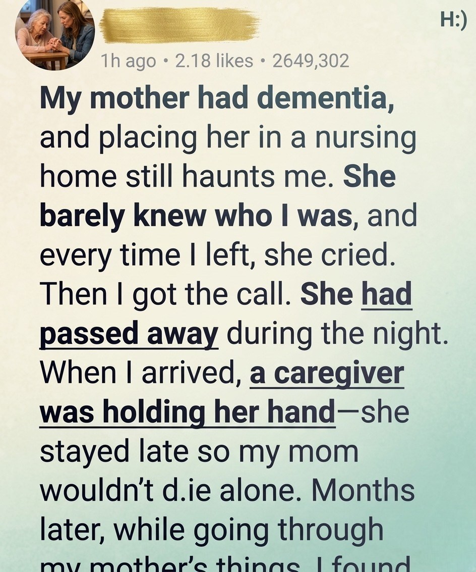 The days after I found the notebook did not unfold in any clean or emotionally organized way. Grief rarely respects structure, and in my case it arrived in waves that seemed to ignore time entirely. Some mornings I woke up with a strange sense of calm, as if my mother were still somewhere just out of reach but not truly gone, and then, without warning, that calm would fracture into something heavier than sadness. I began to notice how memory itself becomes unreliable when it is filtered through guilt. I would replay conversations we had months earlier and reinterpret every word through the lens of what I now knew, or thought I knew, about her final days. The facility, once a place I visited reluctantly, became a location I could not stop thinking about, as if the walls themselves held answers I had failed to notice when I was inside them. I found myself remembering small details with unbearable clarity: the way her blanket was folded, the faint sound of distant televisions in other rooms, the smell of disinfectant that never quite masked the human reality underneath it. And yet, what haunted me most was not the environment itself, but the feeling that I had been moving through it without truly seeing it. I had been present in body, but absent in attention, and that distinction began to feel like the central tragedy of everything that had happened.