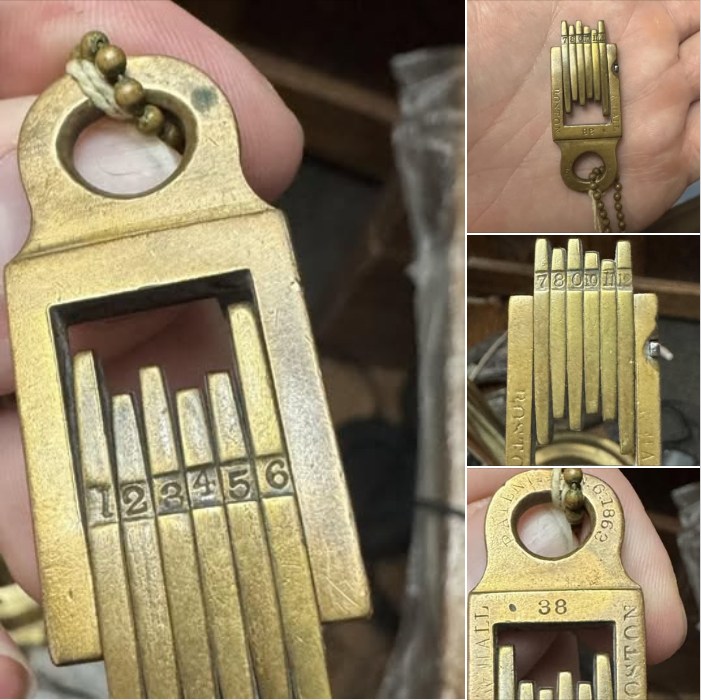 The item is, in fact, an early brass combination lock created by W. Hall and patented in Boston during the American Civil War. Designed to secure small personal belongings such as trunks or lockboxes, it features a simple loop for attachment rather than built-in installation. Unlike modern locks, it uses no keys or rotating dials. Instead, security depends entirely on the precise positioning of twelve numbered brass tabs.