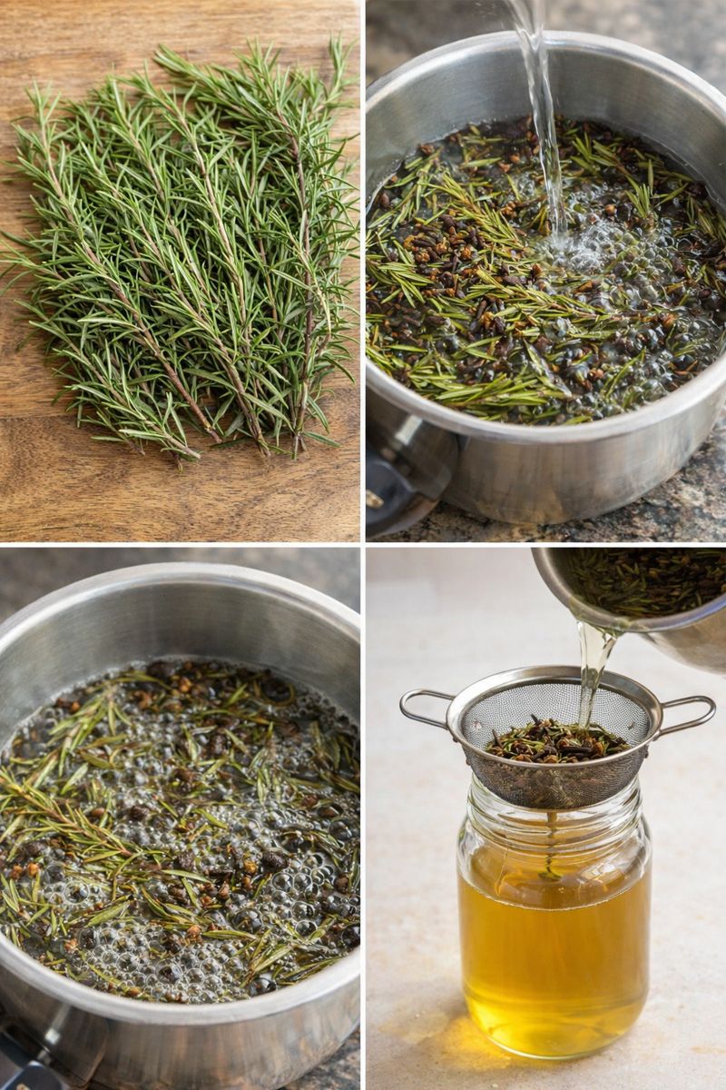 - Rosemary : Rosemary is known for its antibacterial properties and effectiveness against dandruff, and also adds natural shine to hair. Add 2 to 4 sprigs of rosemary to your mixture.