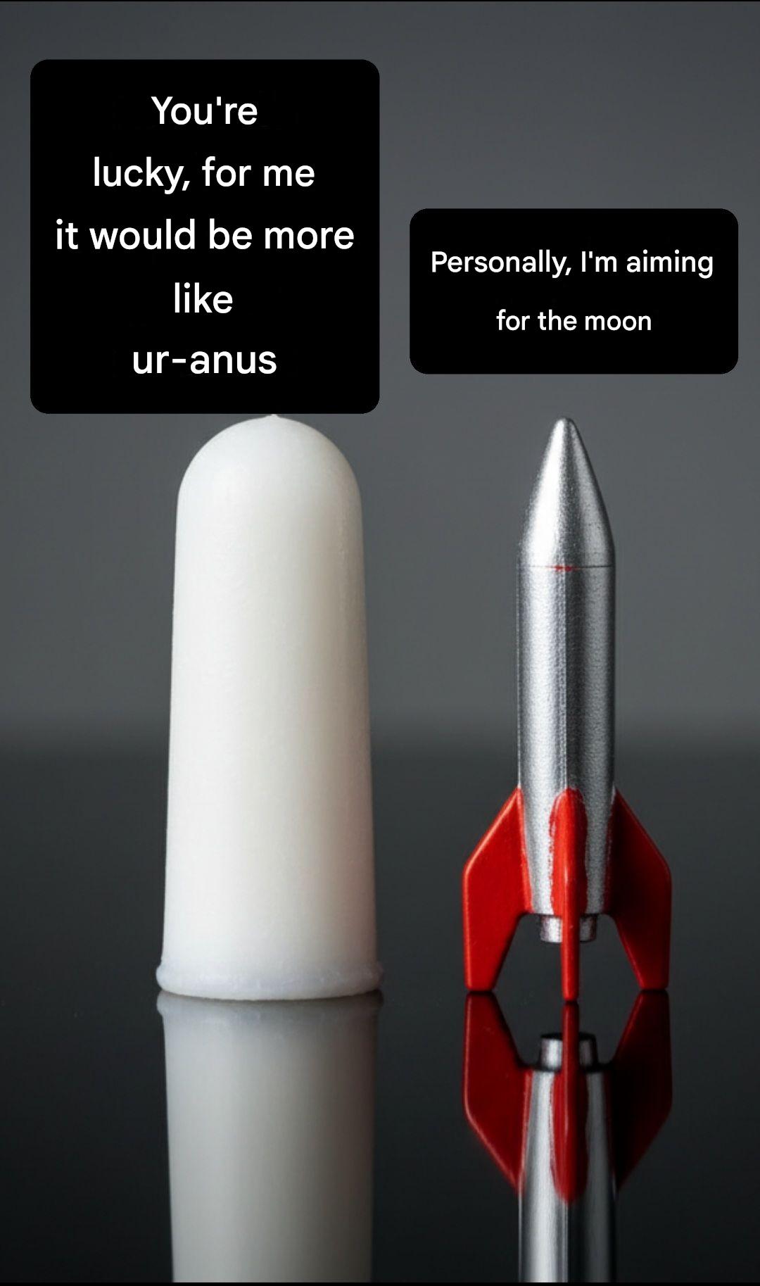 The image shows a humorous comparison using a rocket and a cylindrical object to create a visual joke.
