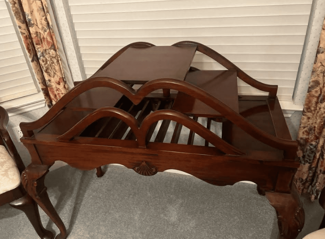 An antique quarter-sawn solid mahogany dessert serving table, its surface glowing with a deep, honeyed patina that only centuries of candlelight, laughter, and quiet moments can create.
